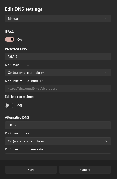 Above are my current personal DNS settings on this Win 11 box – pi-hole is NOT my current provider as this is my work machine so I am willing to take the bad things because often clients will explain about an issue and I need to (as much as I can) replicate the issue. The DNS is set to Quad9 as the main DNS provider with Google as a fallback. Both use encrypted DNS for added security (Micro$oft call it DNS over HTTPS in the dialogue)
